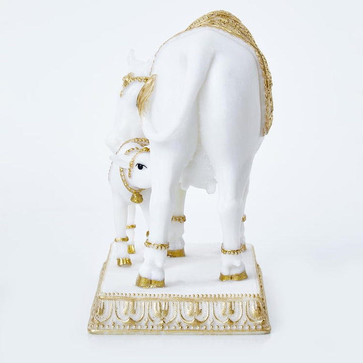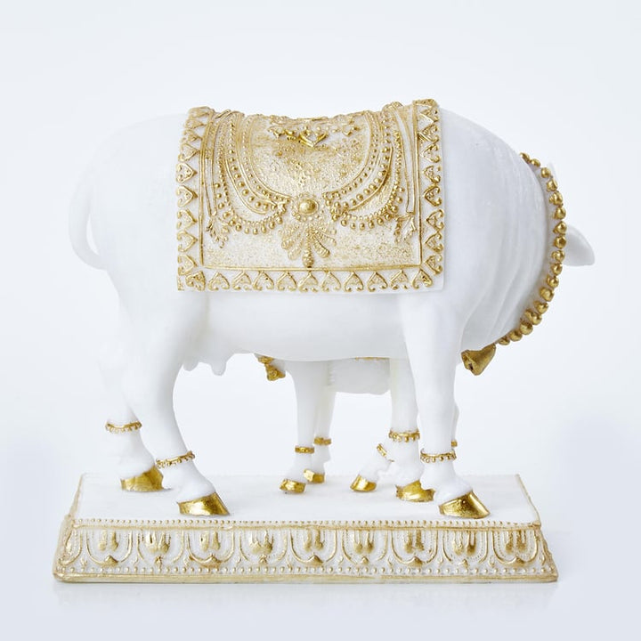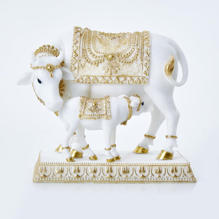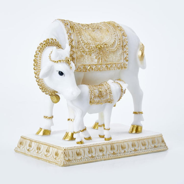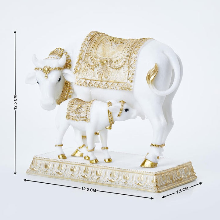 Short Description : Invite divine blessings of prosperity and nurturing love with our Auspicious White & Gold Kamdhenu Cow and Calf Statue. Crafted from pristine polyresin with intricate golden accents, this symbol of abundance is perfect for spiritual home decor and heartfelt gifting.