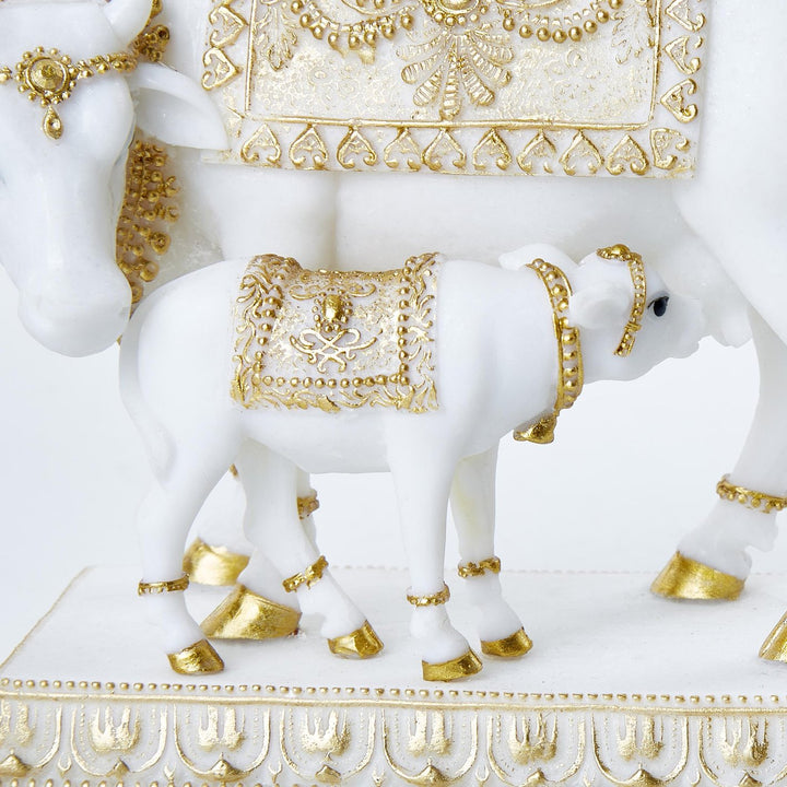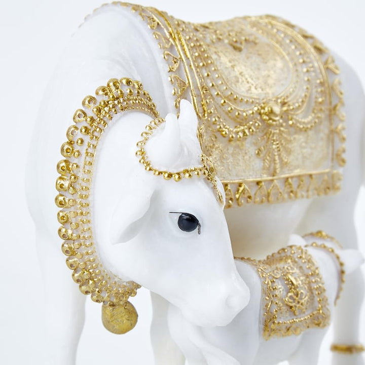 Auspicious White & Gold Kamdhenu Cow and Calf Statue | Divine Nandi Idol for Prosperity, Fertility & Abundance | Sacred Home Mandir Decor & Spiritual Gift