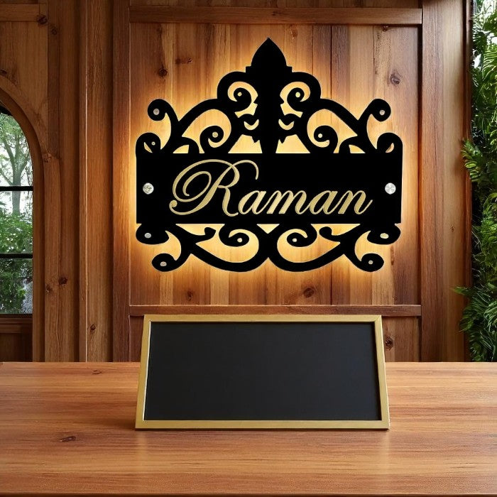 Short Description: Make a grand statement with this exquisitely designed black and gold "Raman" name plate. Its intricate scrollwork and elegant golden script create a sophisticated and welcoming focal point for any home or office entrance. Perfect for adding a touch of classic charm and personalization.