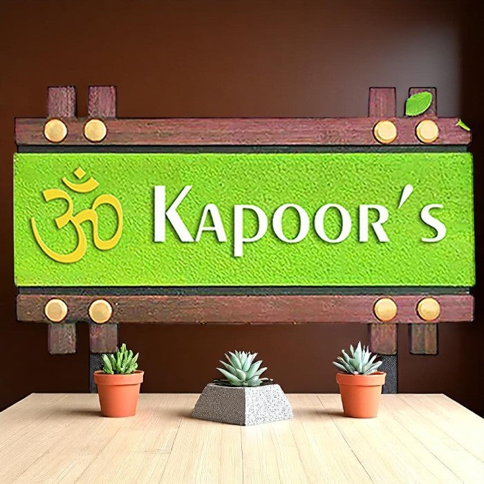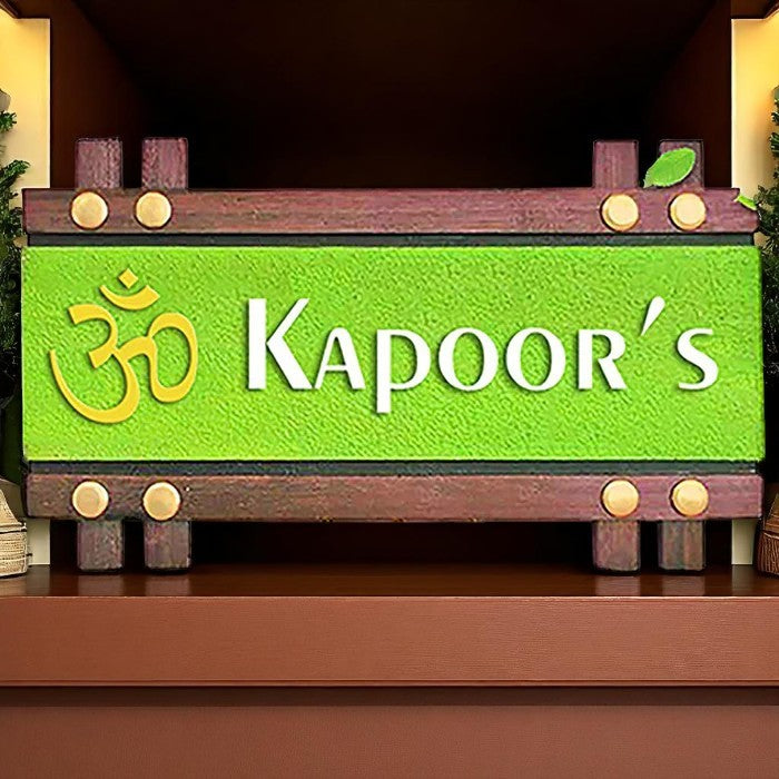 Short Description: Brighten your home with this unique rustic wooden name plate featuring "Kapoor's" in white against a vibrant green background. Adorned with a golden Om symbol, this eco-friendly design brings a blend of traditional charm and natural aesthetics to your entrance, creating a welcoming and auspicious vibe.