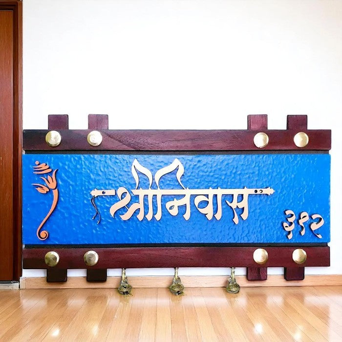 Short Description: Elevate your home's entrance with this beautiful, customized wooden name plate. Featuring the name "Shri Niwas" in elegant Hindi script, a Ganesha motif, and a flute design on a vibrant blue background, it adds a touch of traditional charm and personalization to your abode.