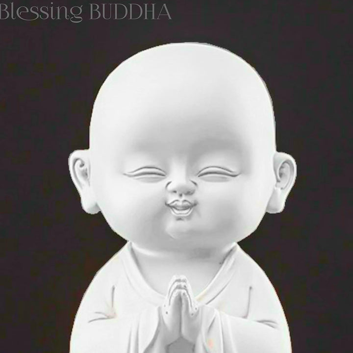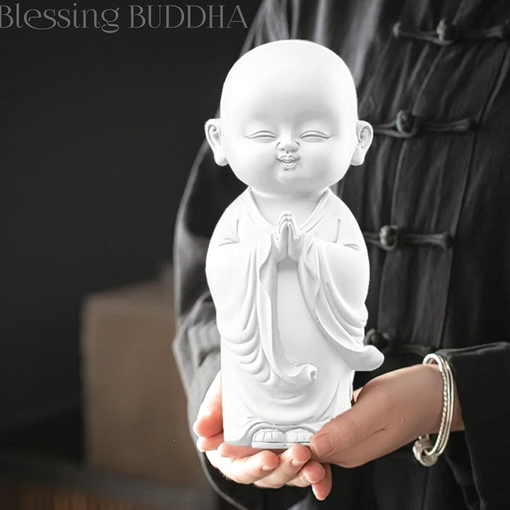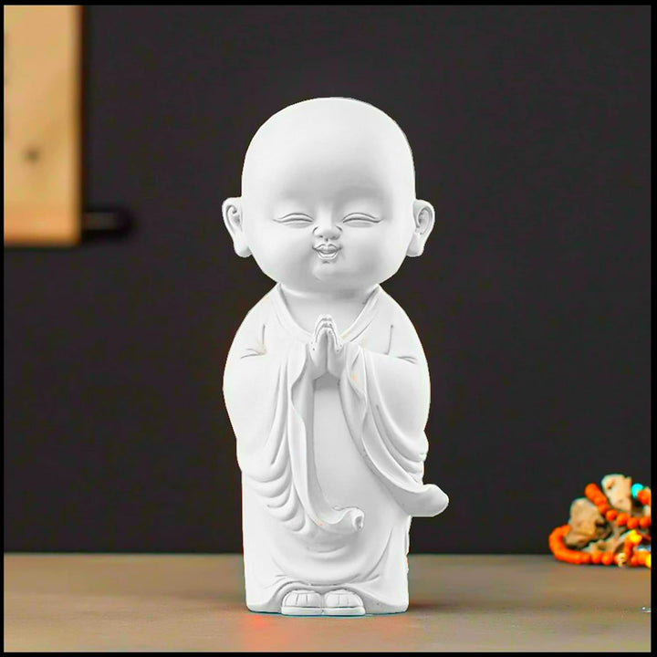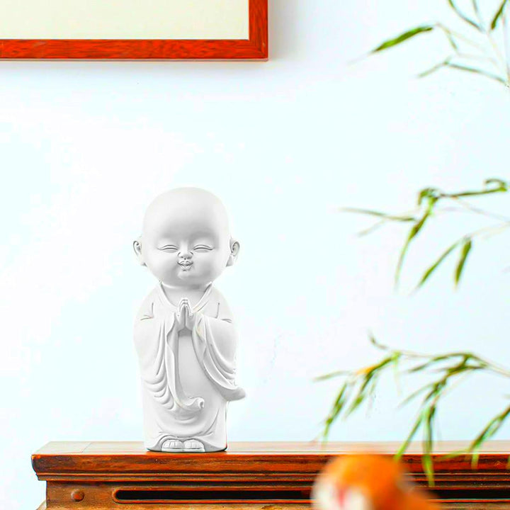 Cute White Resin Standing Buddha Statue| Small Zen Monk Figurine for Home Decor, Desk & Peaceful Gifting | Serenity & Joy