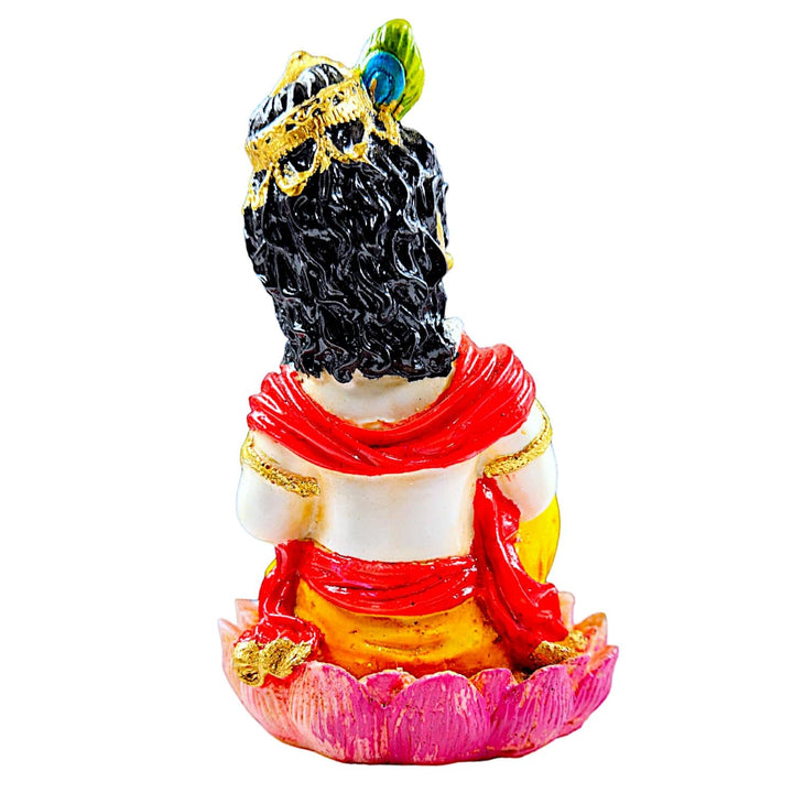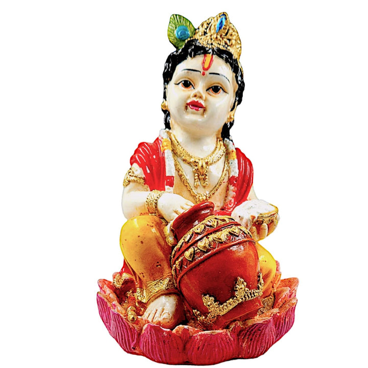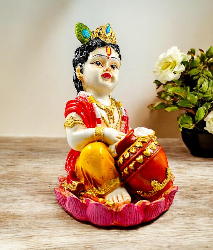 Short Description : Capture the playful spirit of Lord Krishna as a child with our enchanting Resin Bal Krishna Eating Makhan Statue! Seated on a lotus, this vibrant idol brings sweetness, happiness, and prosperity to your home.