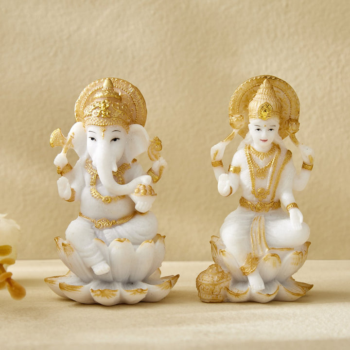 Divine White Ganesha & Laxmi Figurine Set with Gold Accents | Polyresin Idols for Wealth, Wisdom, Diwali & Auspicious Home Temple Decor Gift
