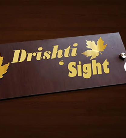 Short Description: Personalize your workspace or home with this elegant wooden desk name plate. Featuring "Drishti" and "Sight") in golden lettering, accented by beautiful golden maple leaves. This sophisticated piece adds a touch of nature-inspired elegance and personalization to any table or desk.