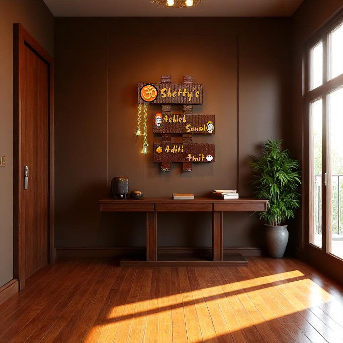 Short Description: Create a grand family welcome with this unique multi-tiered wooden name plate. Featuring "Shetty's" at the top, followed by "Richa & Swapnil" and "Aditi & Rohit," this rustic design with golden accents and decorative bells adds a personalized and traditional touch to your home entrance.