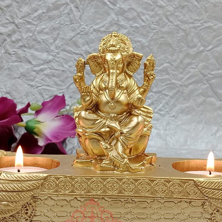 Golden Ganesha Idol with Peacock Design & Tealight Holder – Premium Resin Decorative Showpiece for Home Temple & Gifting