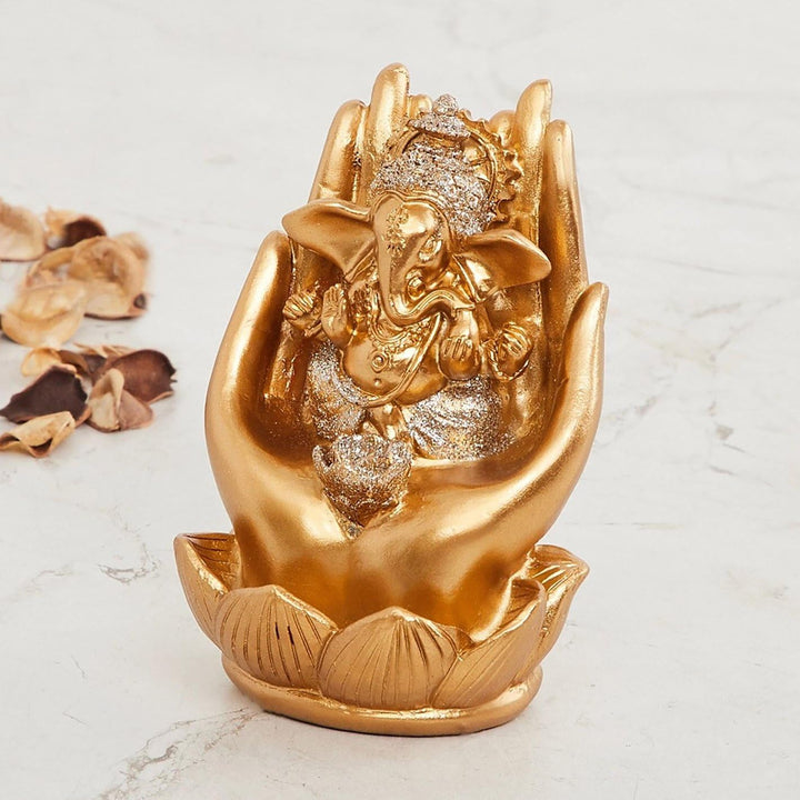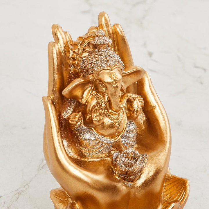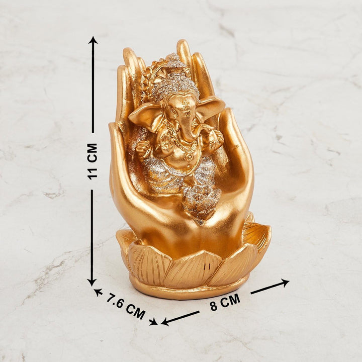Golden Ganesha in Cupped Hands Statue | Resin Lord Ganesh Idol on Lotus | Divine Protection & Blessings Home Decor | Auspicious Gift for Good Luck