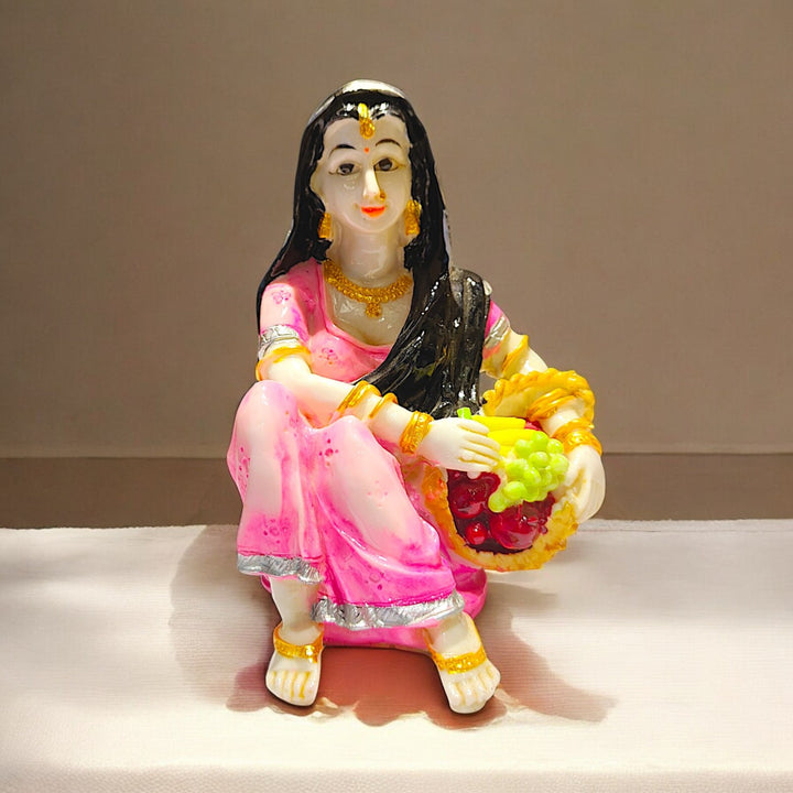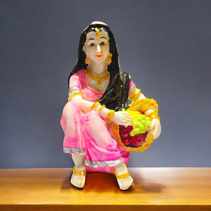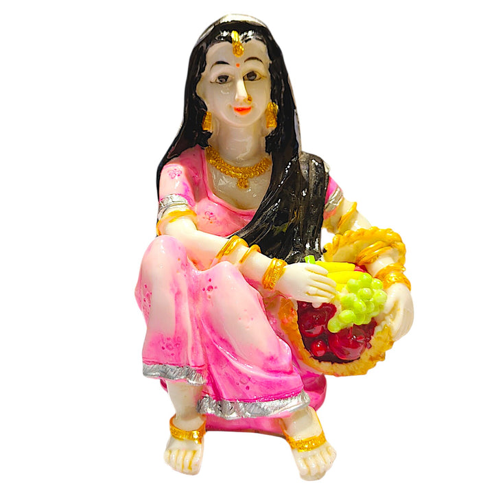Short Description : Bring home a glimpse of rural India with this vibrant Rajasthani woman figurine carrying a basket of fruits . A blend of tradition and elegance — perfect for ethnic home decor and festive gifting