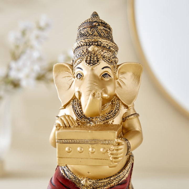 🐘🎶 Joyful Golden Lord Ganesha with Musical Box Statue: Invite harmony, prosperity, and artistic blessings into your home with this magnificent Polyresin Ganesha figurine, depicted playing a musical instrument.