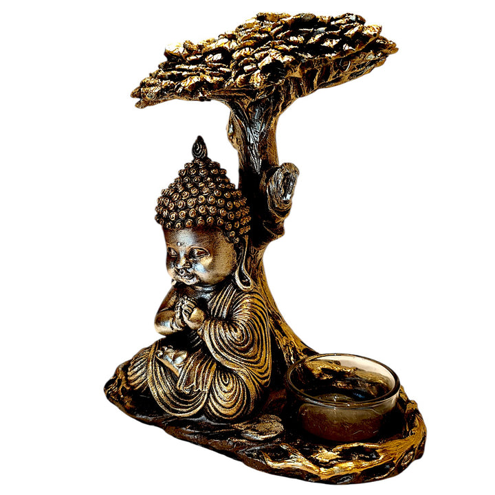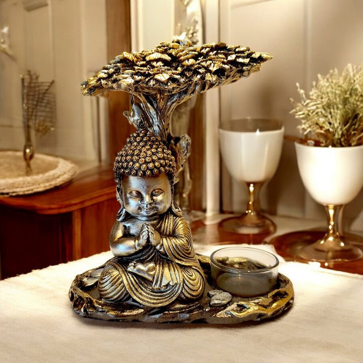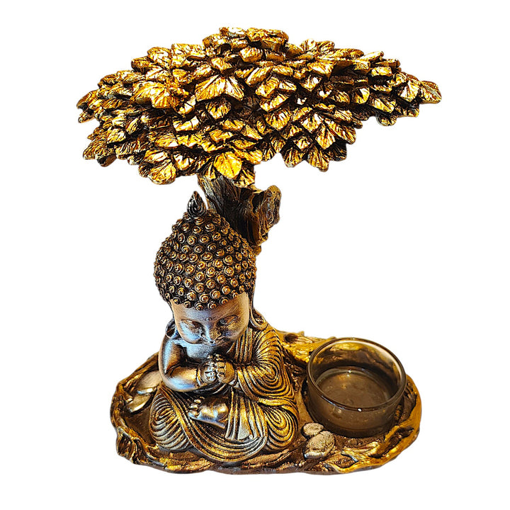 Short Description : Bring peace, light, and positivity into your home with this elegant Golden Baby Buddha Idol featuring a sacred tree and tealight holder. Perfect for home décor, meditation spaces, and spiritual gifting.