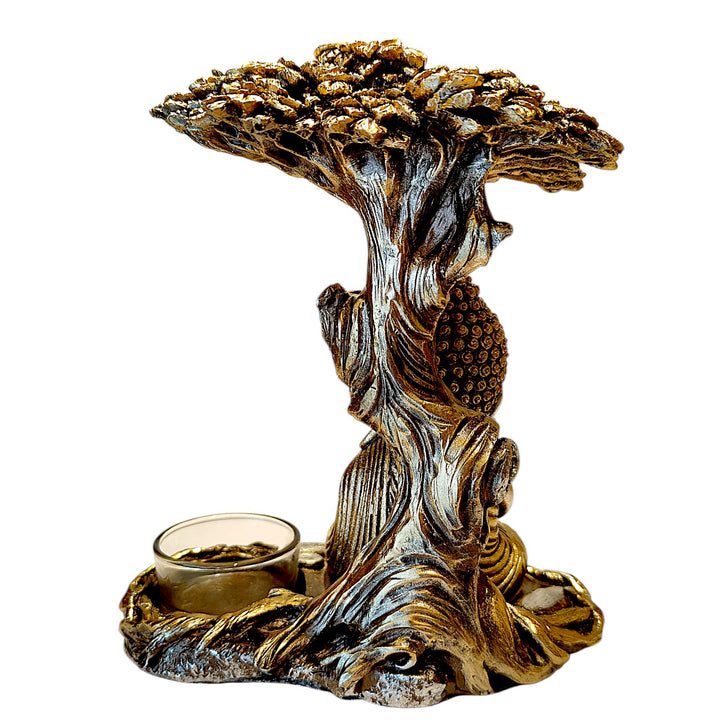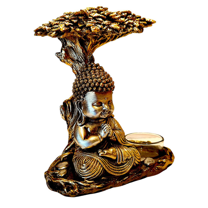 Karigaari India Golden Baby Buddha with Tree & Tealight Holder | Resin Meditation Buddha Idol for Home Decor, Living Room, Spiritual Corner & Gifting