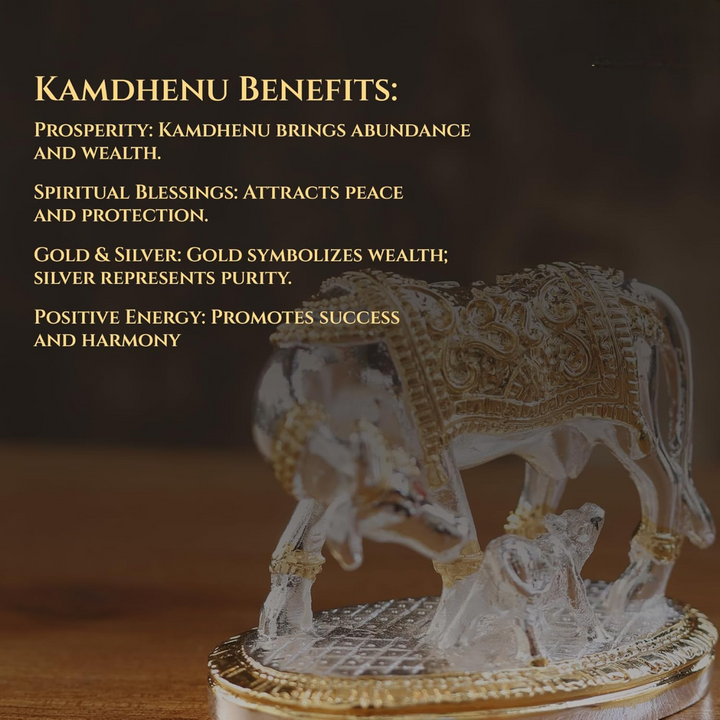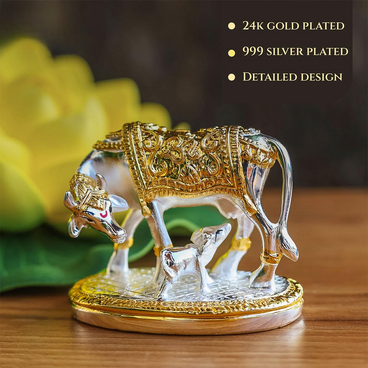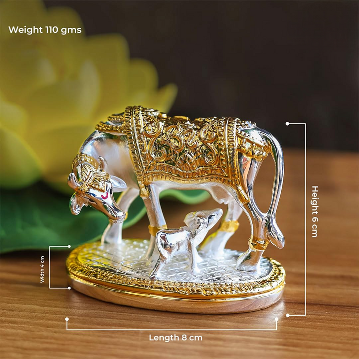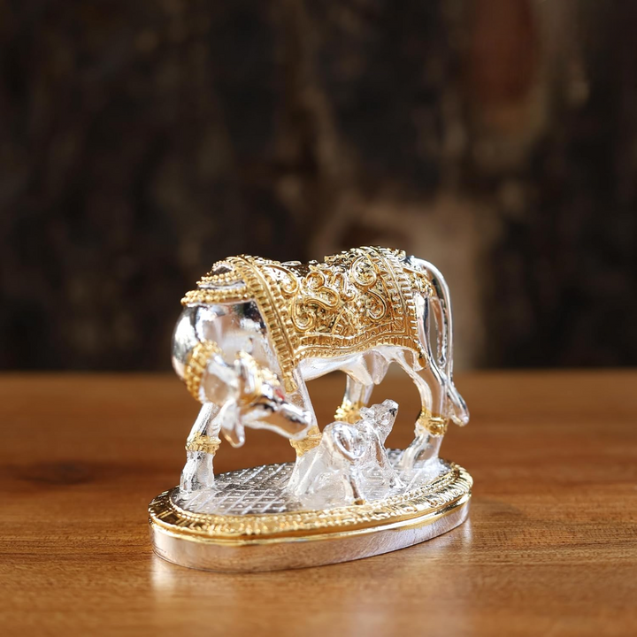 Short Description : Beautifully crafted Kamdhenu Cow idol in gold and silver plated finish, made from premium resin. Symbol of prosperity and divinity β ideal for pooja rooms, vastu decor, and spiritual gifting.
