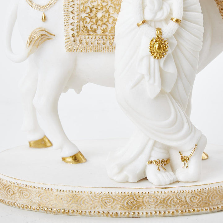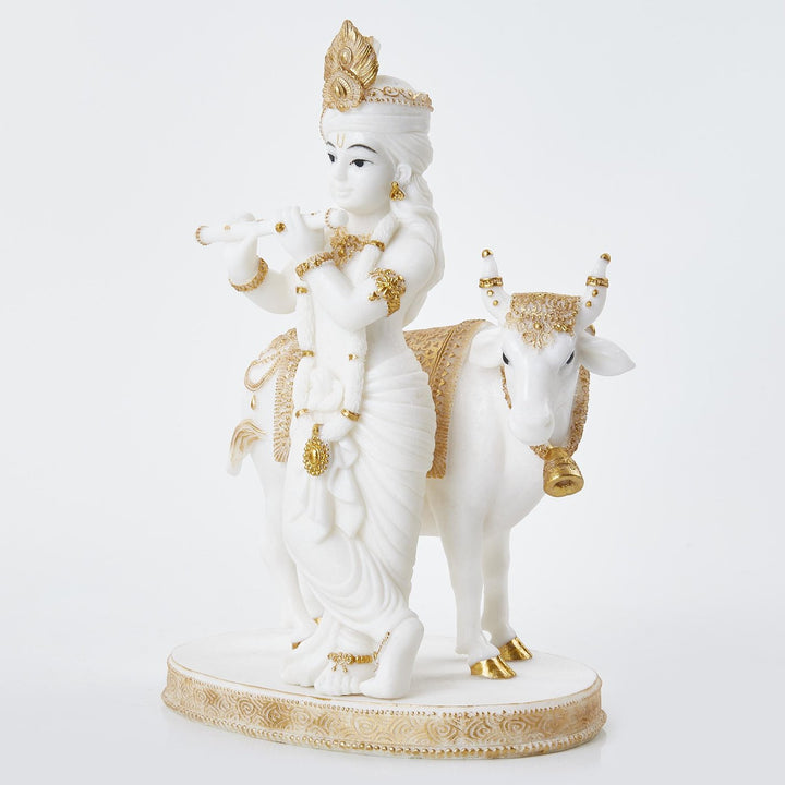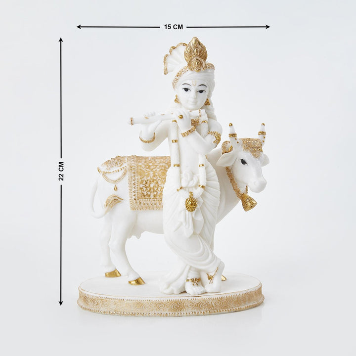Short Description :This elegant white and gold Lord Krishna with Cow idol made from high-quality resin is a beautiful symbol of love, peace, and divinity. Perfect for pooja decor, gifting, or spiritual home styling.