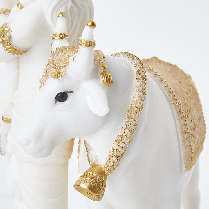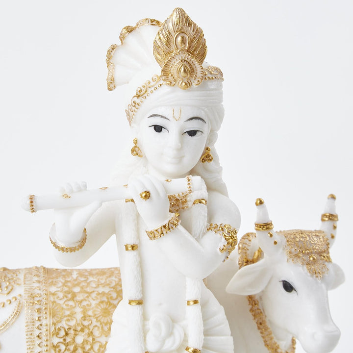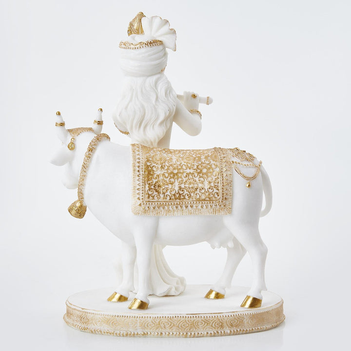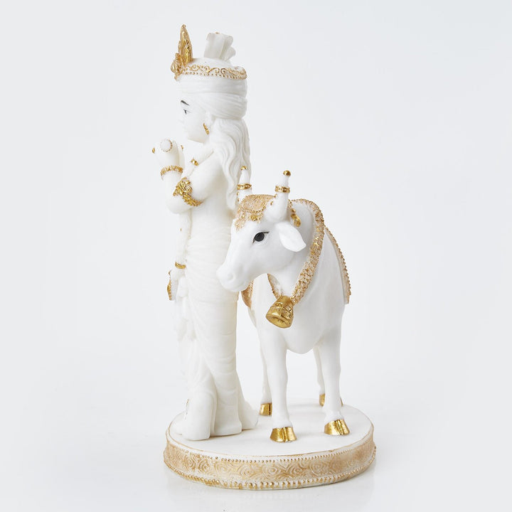 Karigaari India White & Gold Resin Krishna with Cow Idol | Handcrafted Lord Krishna Playing Flute Figurine | Elegant Spiritual Home Decor Showpiece for Temple, Living Room, Gift Purpose
