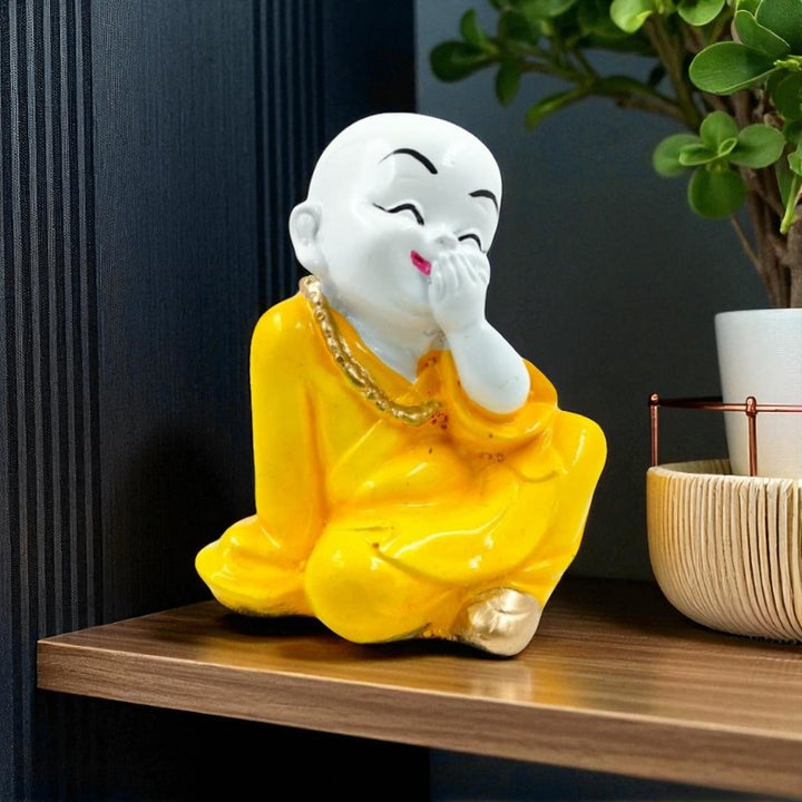 Short Description : Invite a sense of gentle joy and serene happiness into your home with our delightful Polyresin Giggling Baby Monk Buddha Idol. With his hand playfully covering a chuckle and eyes closed in bliss, this yellow-robed statue radiates peaceful contentment, perfect for any space or as a heart warming gift.
