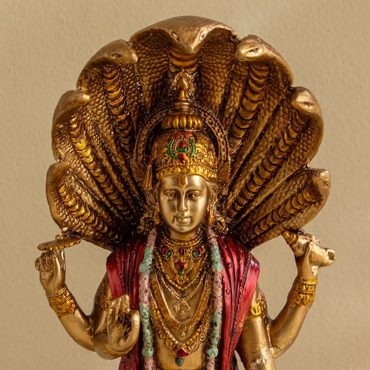 This intricately detailed Vishnu figurine captures divine grace, featuring Sheshnag and standing on a lotus pedestal for spiritual elegance.