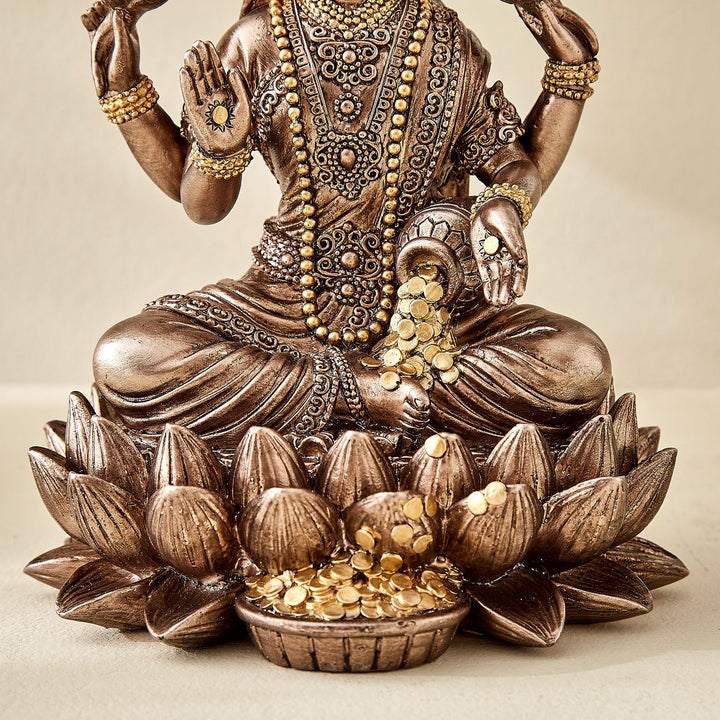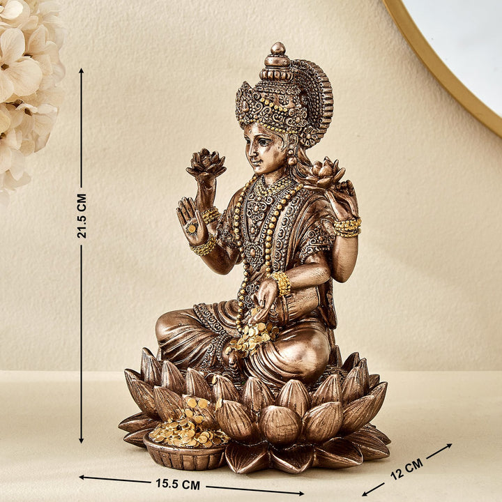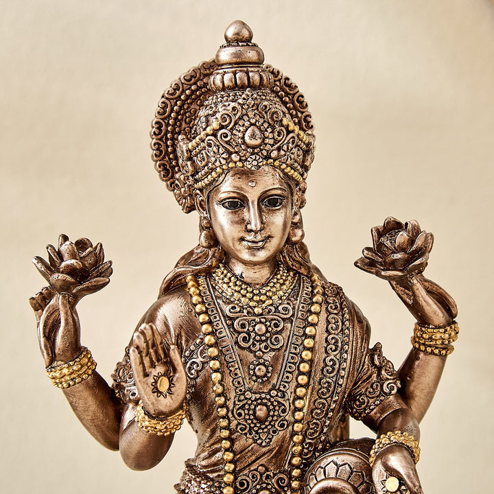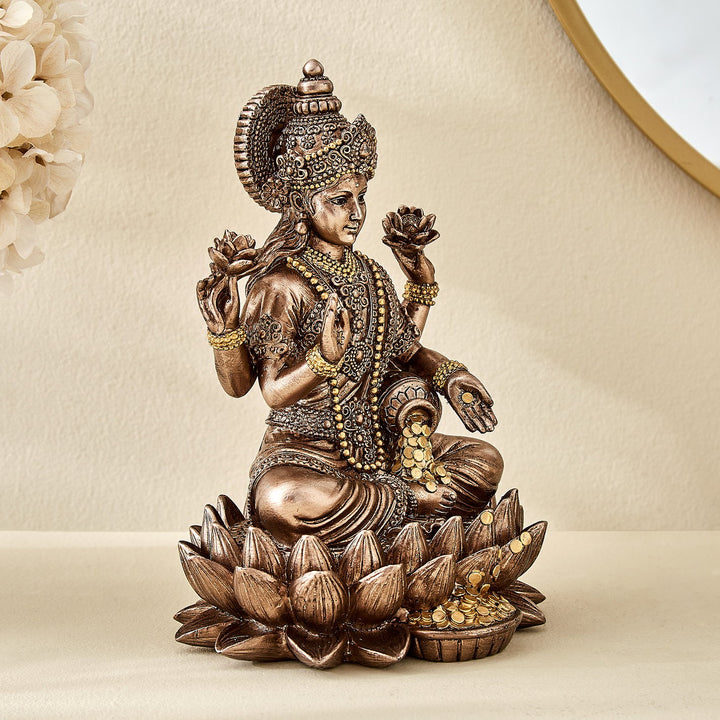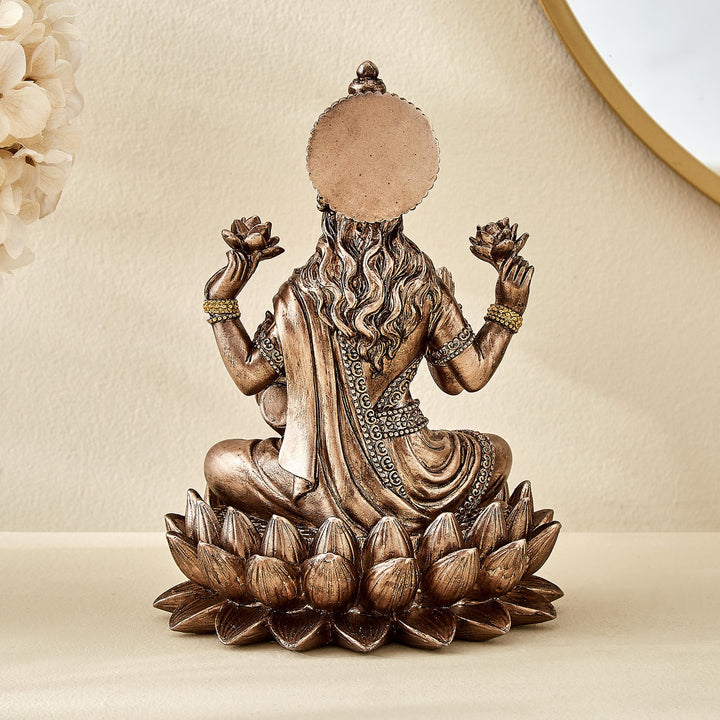 Exquisitely crafted resin statue of Goddess Lakshmi seated gracefully on a lotus.