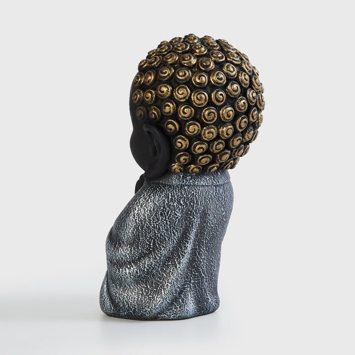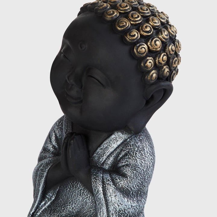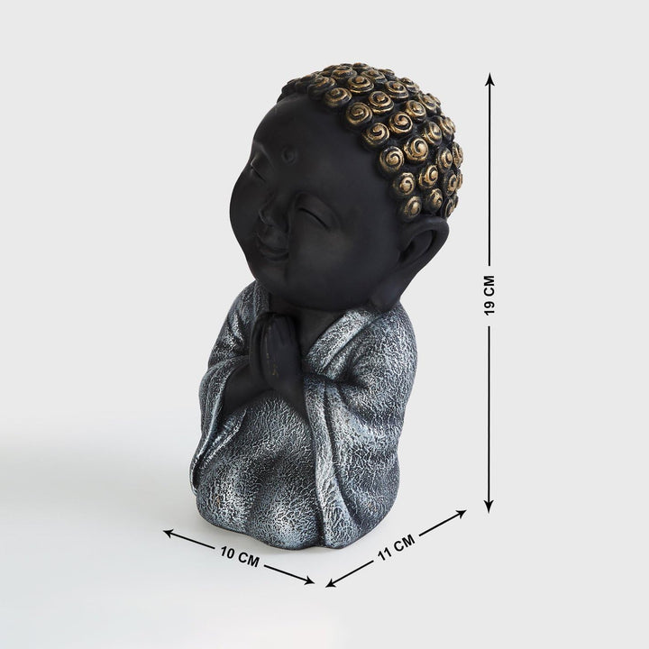 Short Description : Invite peace and tranquility into your space with this beautiful Praying Buddha idol. Crafted from durable resin with a sophisticated black and silver finish, it's a perfect symbol of serenity for home decor or a thoughtful spiritual gift.