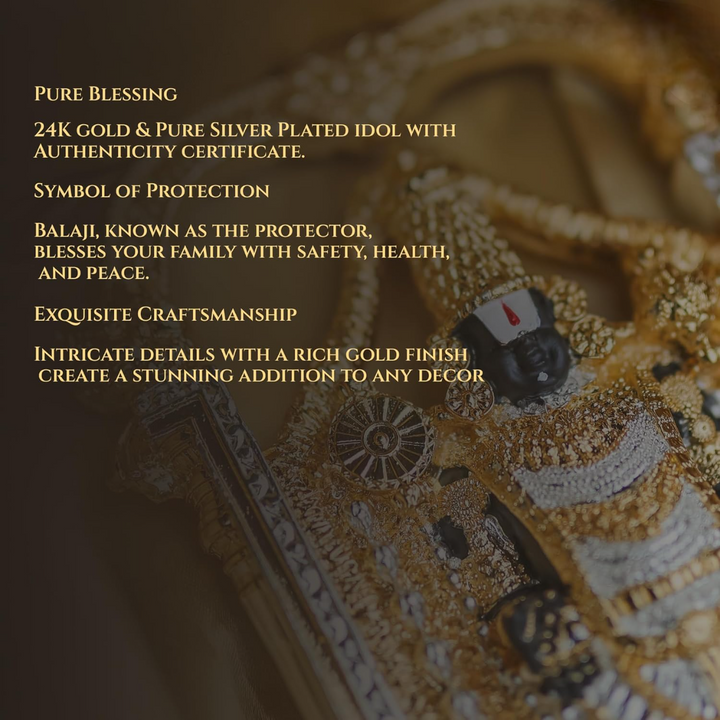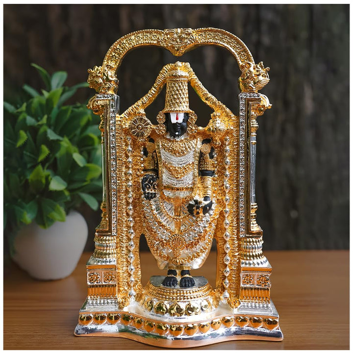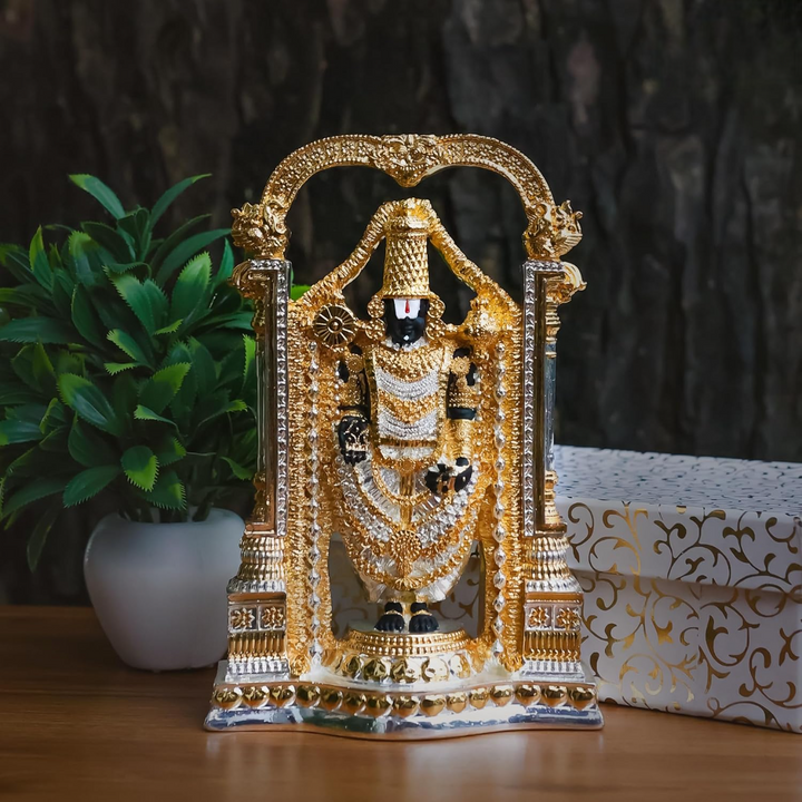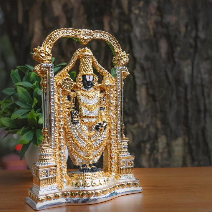 Short Description : Experience divine blessings with this exquisite Tirupati Balaji Resin Idol, beautifully crafted and gold-silver plated for a radiant finish. Perfect for home decor, pooja mandir, and spiritual gifting.