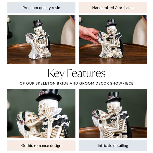 ✨ Intricate & Detailed Design: Each skeleton is meticulously sculpted with realistic details, adorned with a miniature top hat, veil, and floral accents, capturing their eternal bond.
