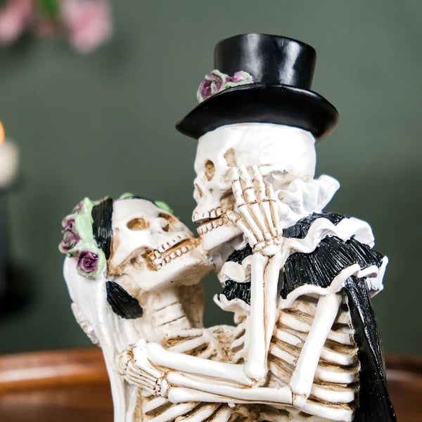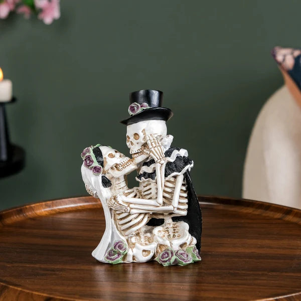 💀👰♀️🤵♂️ Unique Skeleton Bride & Groom Figurine: Celebrate eternal love with a delightfully quirky twist! This polyresin statue features a skeleton bride and groom in a tender embrace.