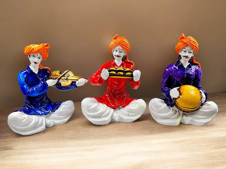 Vibrant Rajasthani Musician Figurine Set of 3| Traditional Indian Folk Art Resin Statues for Home Decor & Cultural Gifting