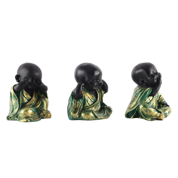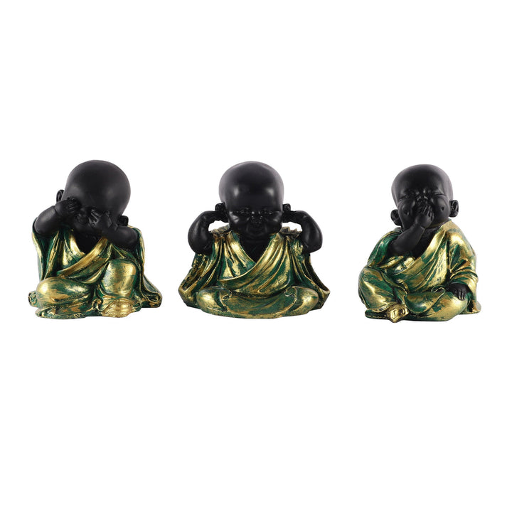 Short Description : Invite serenity and timeless wisdom with this adorable set of three Buddha monks. Crafted from matte black resin with radiant gold and green robes, they embody the ancient principle of "See No Evil, Hear No Evil, Speak No Evil," perfect for unique home decor or a thoughtful gift.